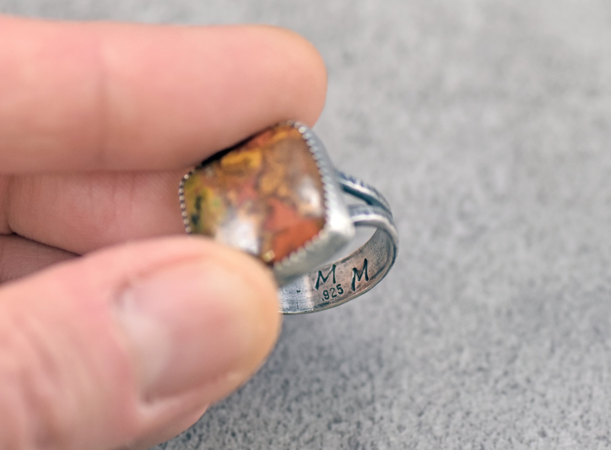 The band has been hand-textured, then oxidized and polished. My maker's mark (initials) and .925 for sterling silver are stamped on the inside of the band.