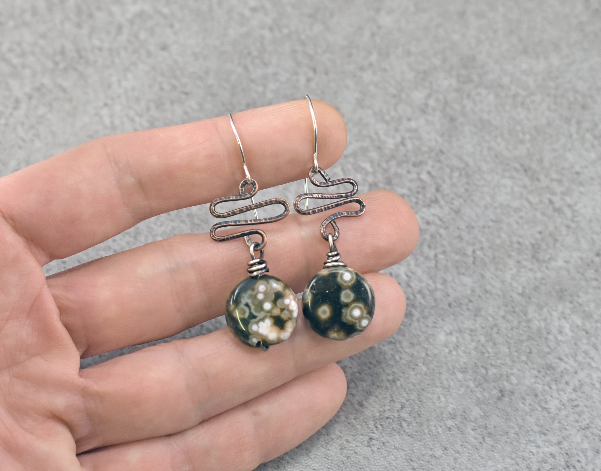 These rustic earrings feature beautiful green ocean jasper stones, handforged copper wire and oxidized sterling silver wire.