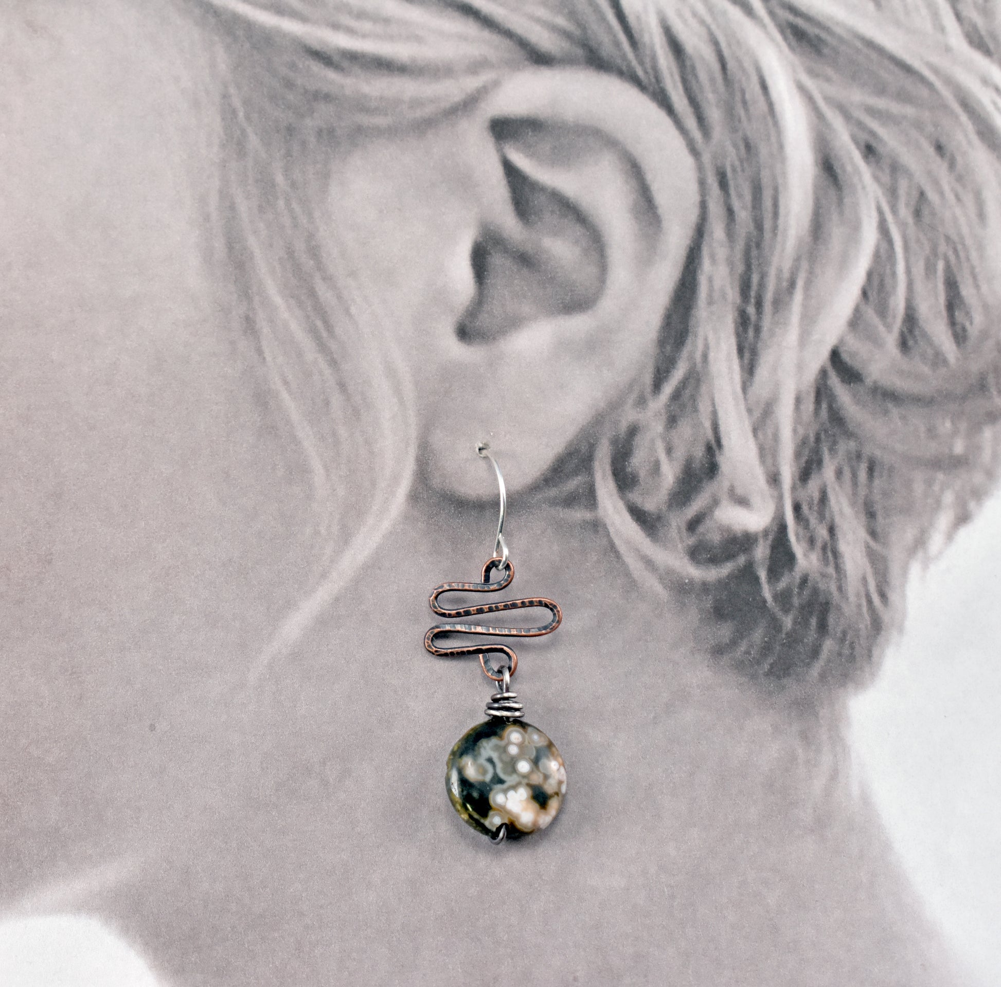 Ocean Jasper Mixed Metal Earrings, Unique Green Stone and Copper Wire Jewelry