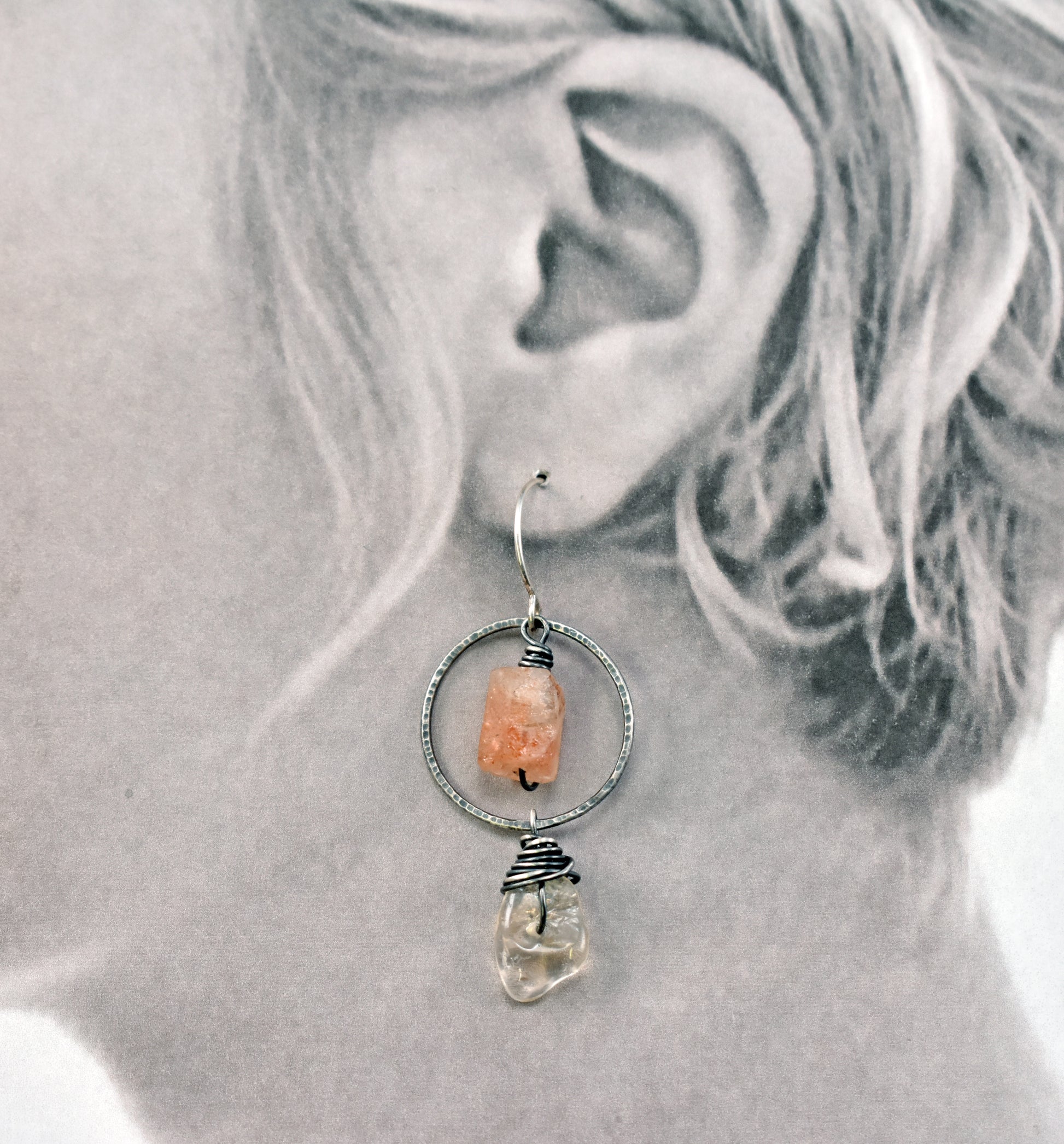 These rustic asymmetrical dangle earrings are made with lovely raw sunstone and citrine beads in shades of yellow and orange. The wire circles are handmade from sterling silver wire and have been textured, oxidized and polished.