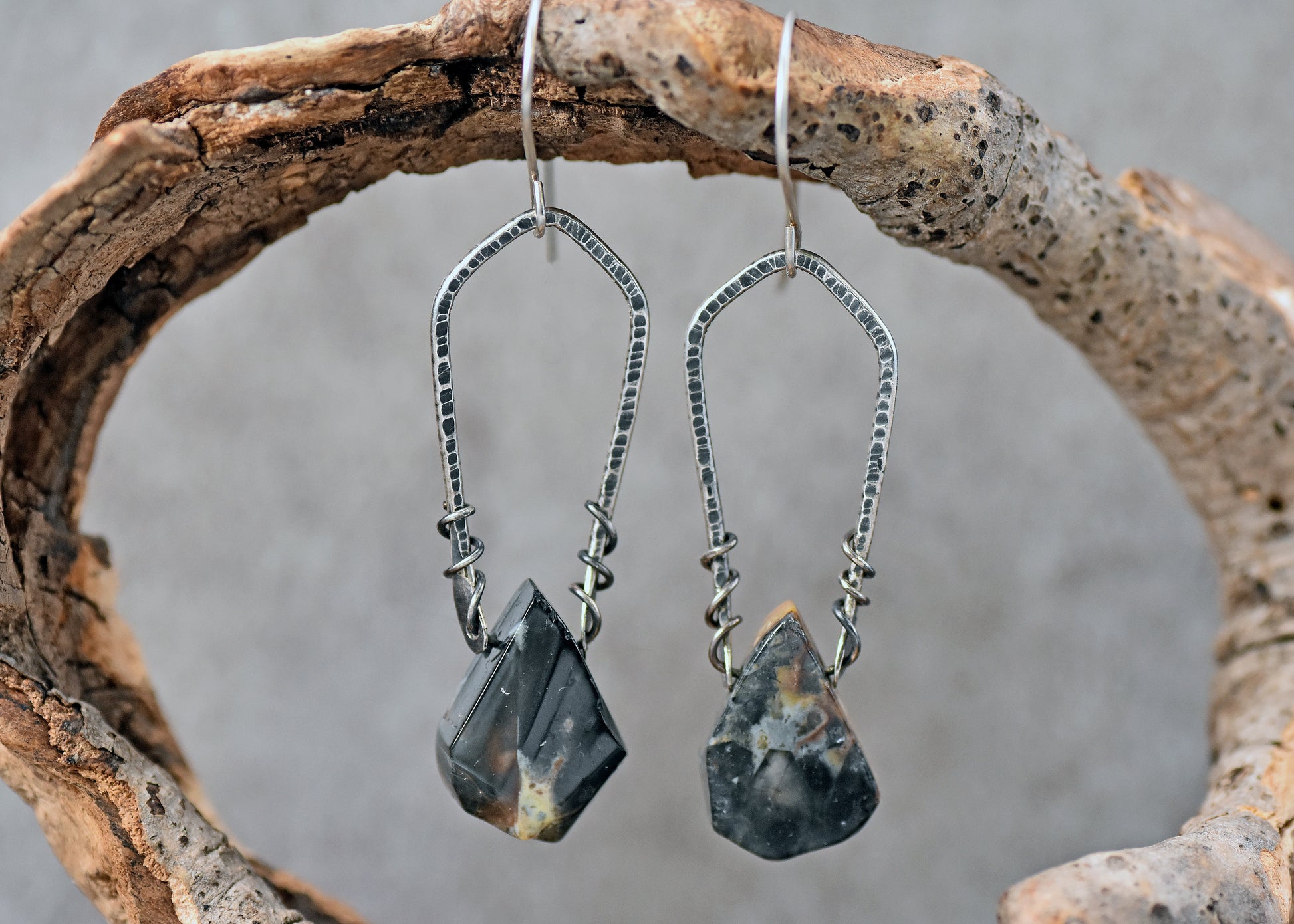 These rustic sterling silver earrings feature beautiful rutilated quartz stones and textured, oxidized wire.