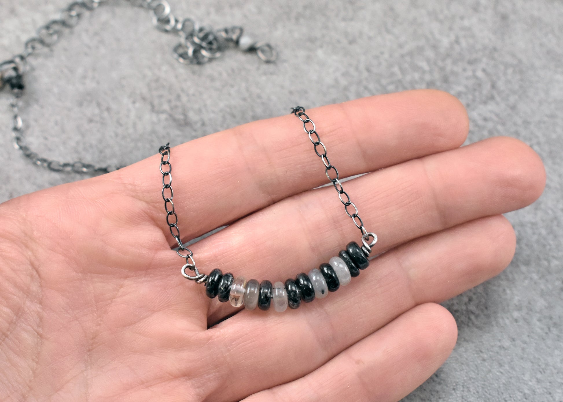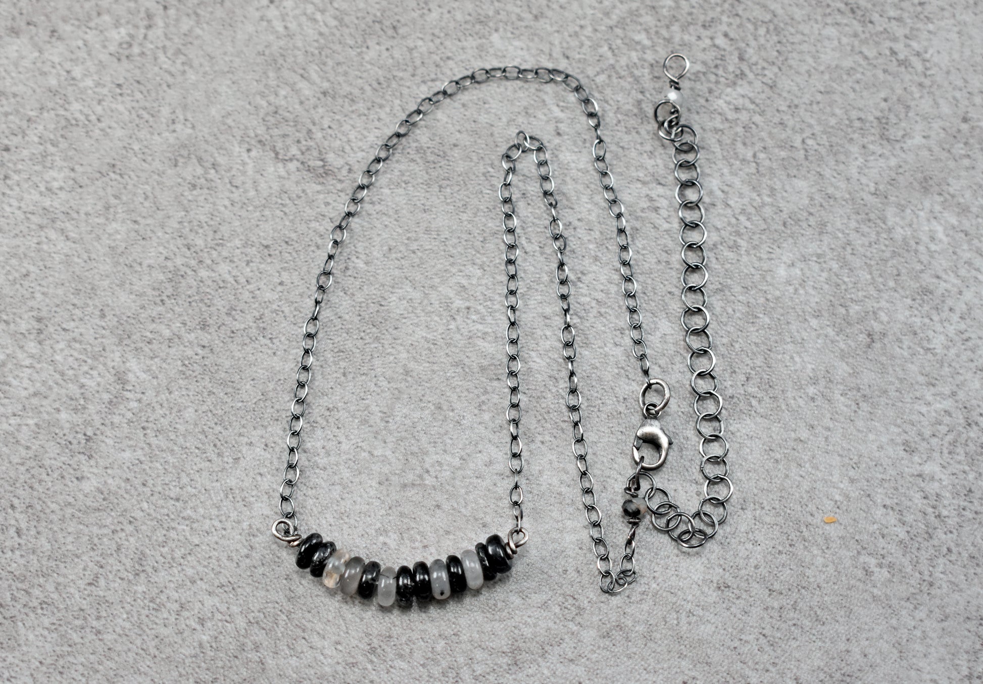 Chain length (including beads): 15 inches with a 4 inch extender (can be worn anywhere between 15 and 19 inches; images show the chain worn at 15 inches).