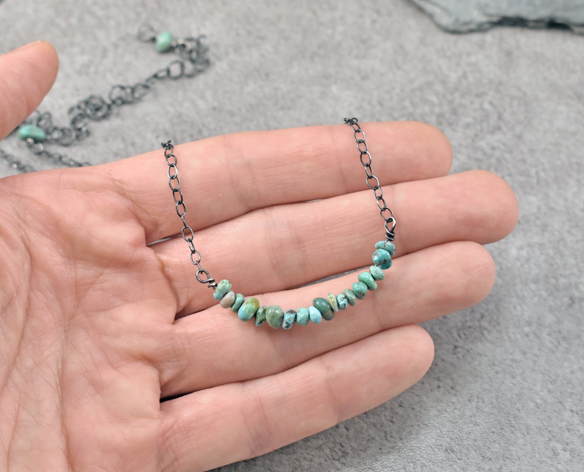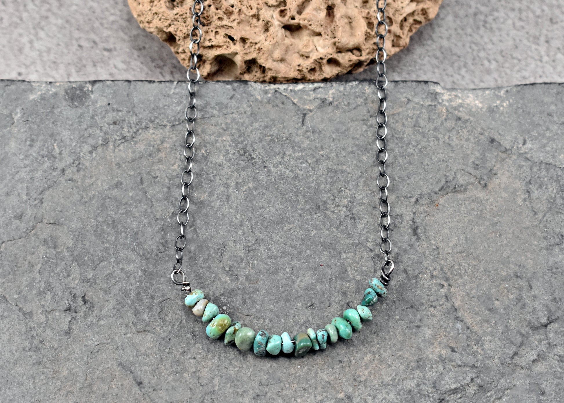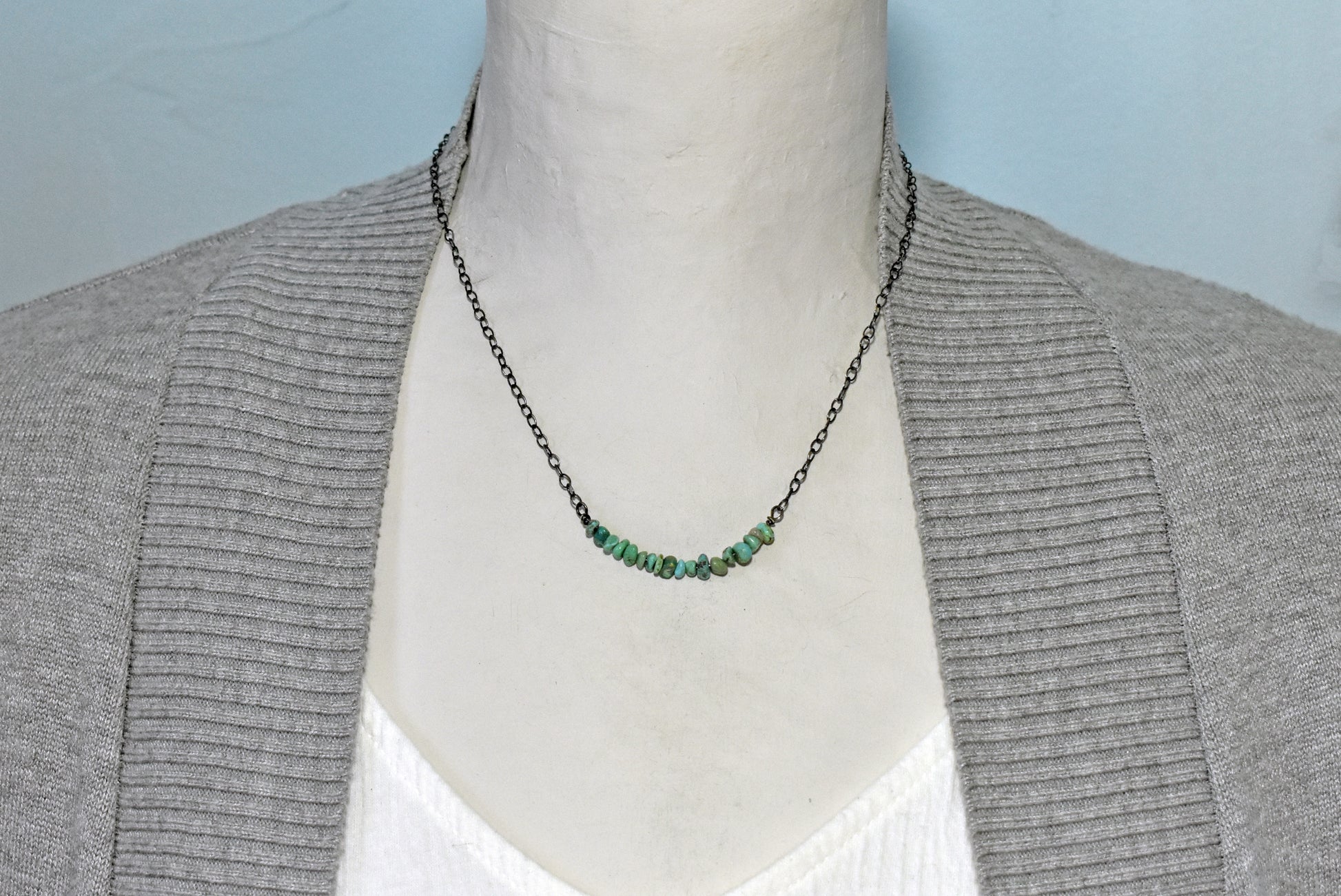 This simple, rustic necklace features natural turquoise beads and sterling silver chain. It closes with a sterling silver lobster clasp.