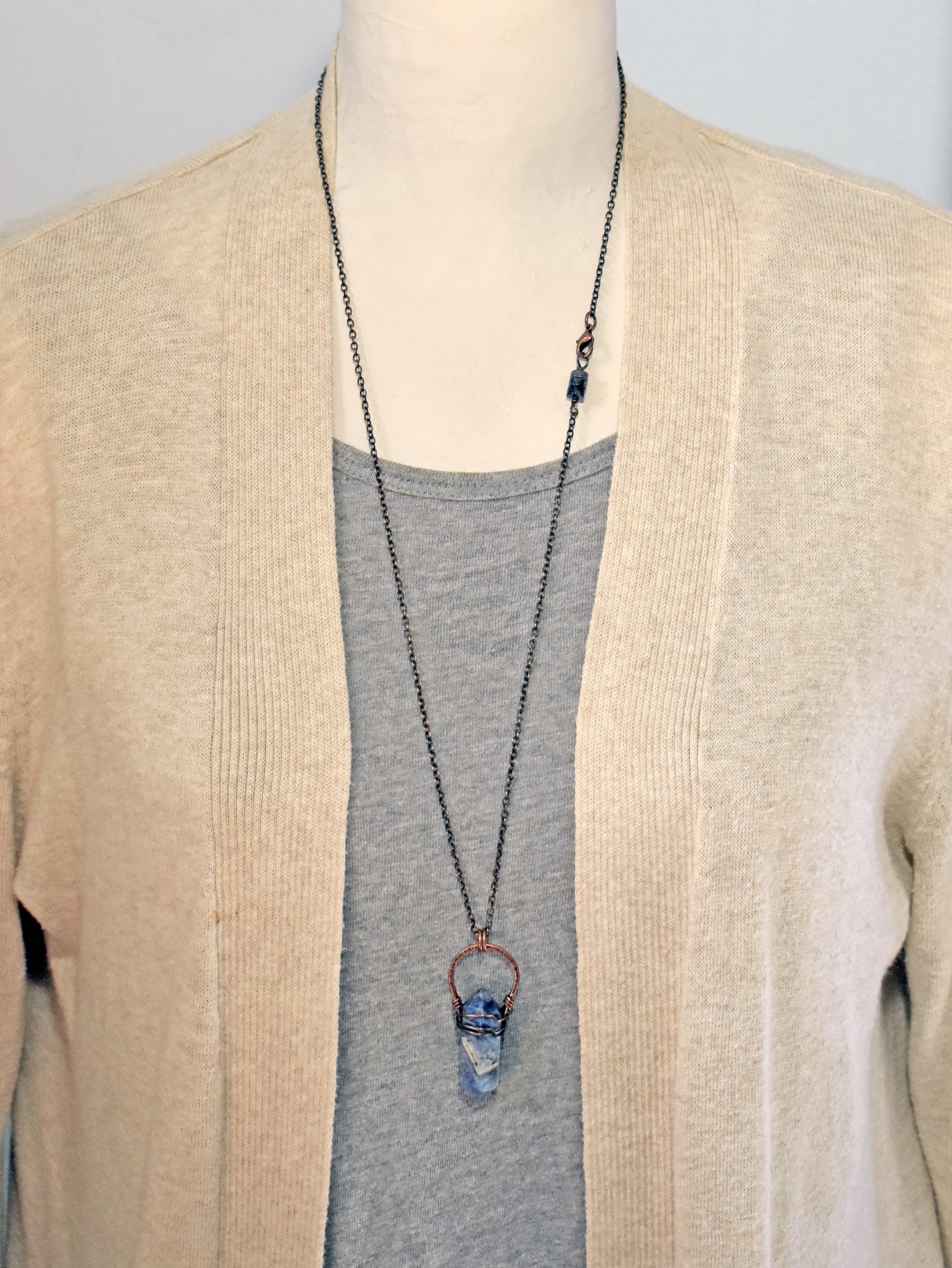 This rustic necklace features a natural double terminated sodalite bead, hammered copper wire and oxidized copper chain.