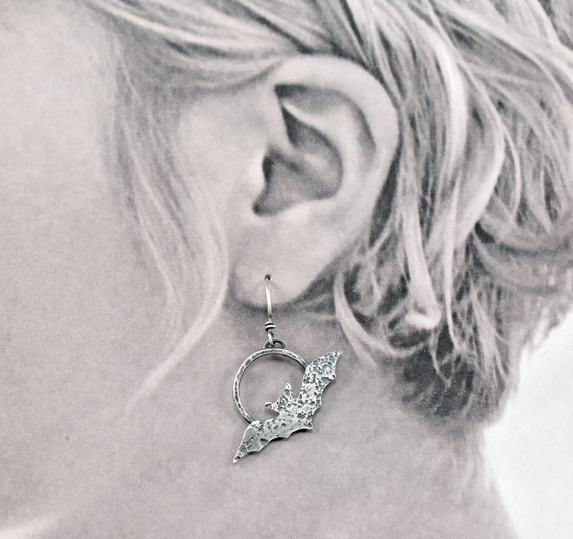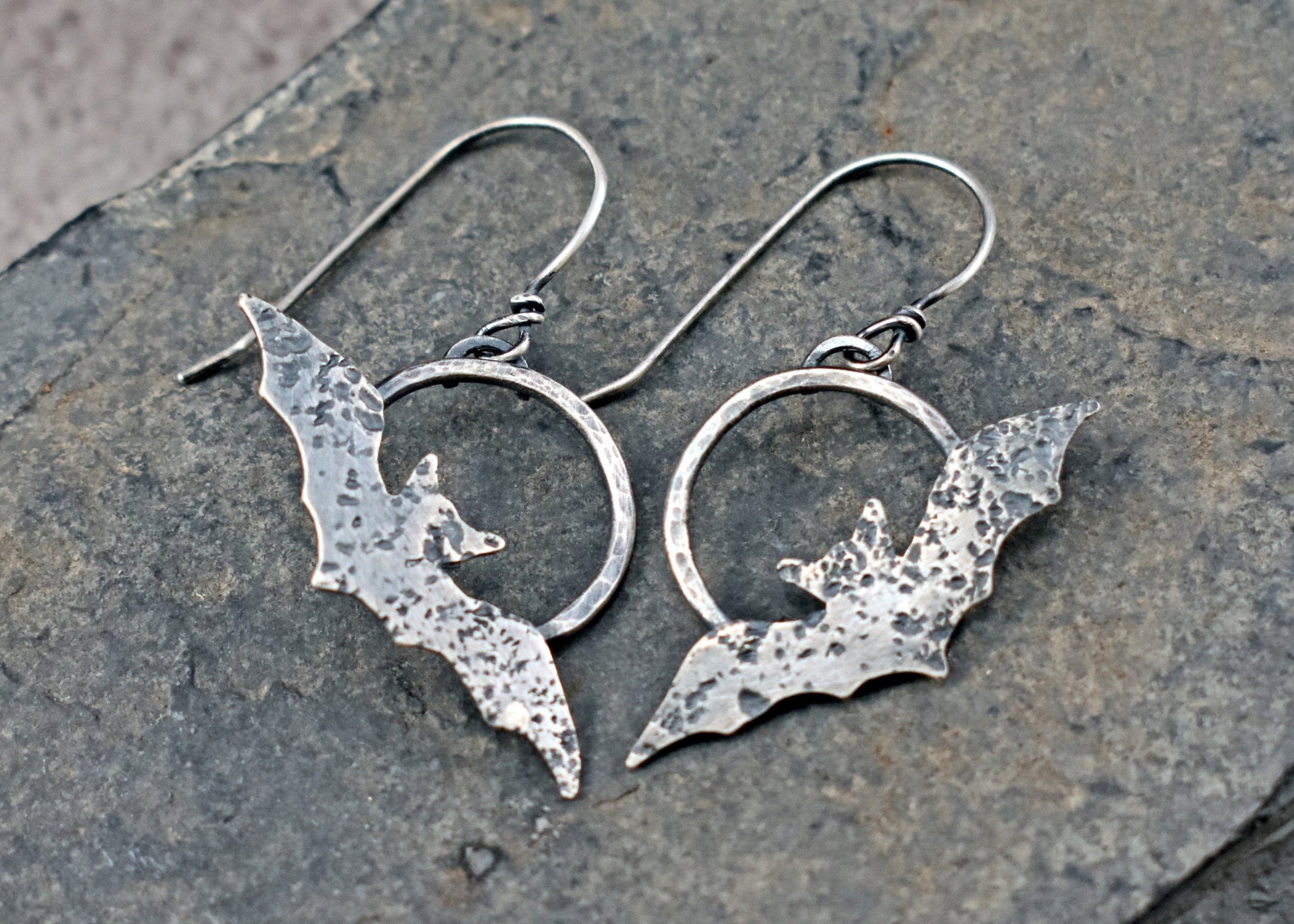 See the matching necklace here: https://www.littlemisshaywire.com/products/sterling-silver-handmade-bat-necklace-rustic-artisan-halloween-jewelry