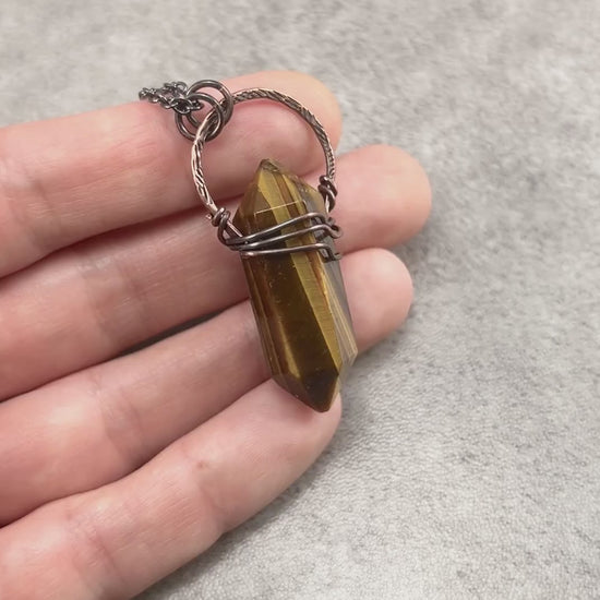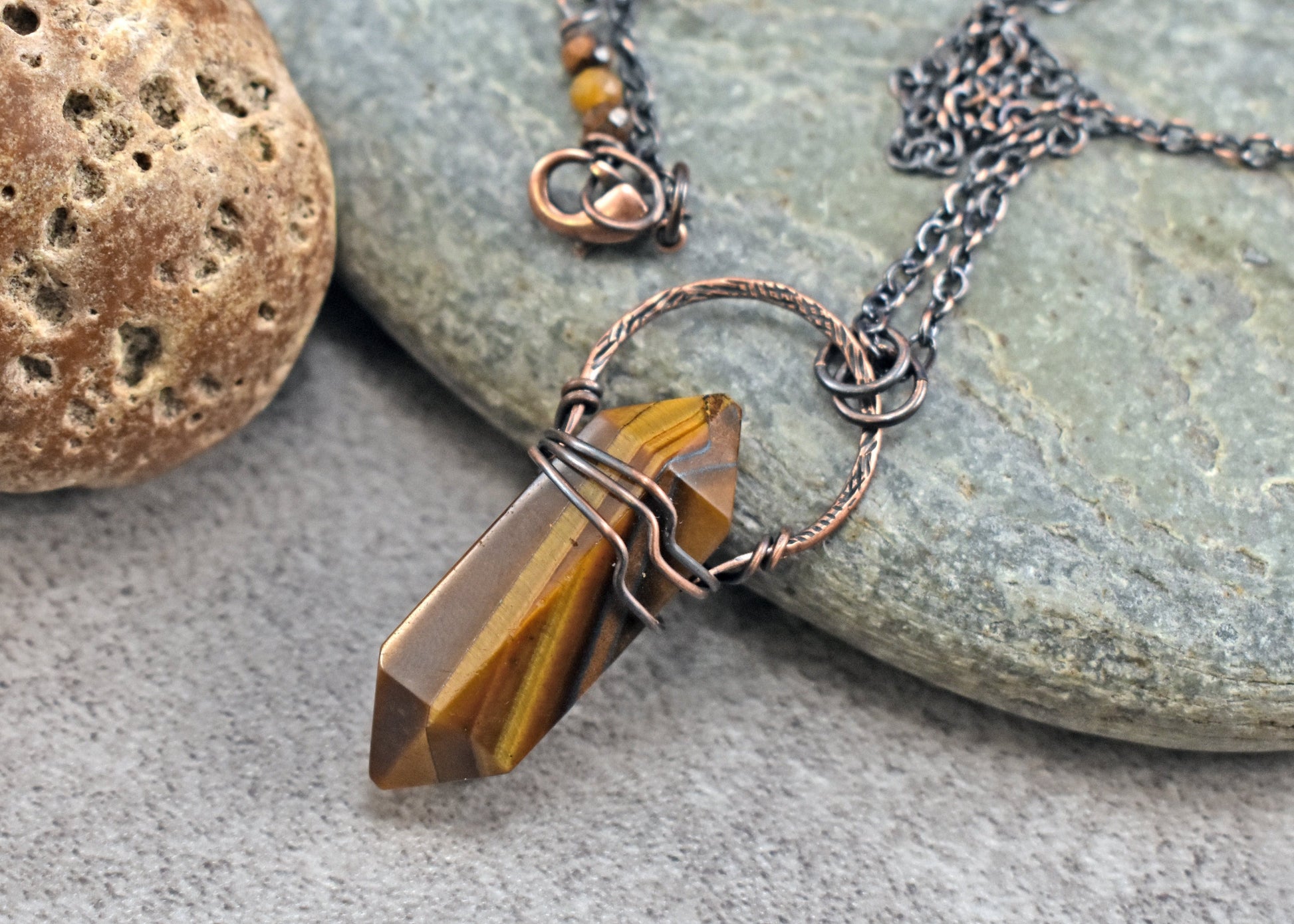 This rustic necklace features a natural double terminated tiger's eye stone, hammered copper wire and oxidized copper chain.