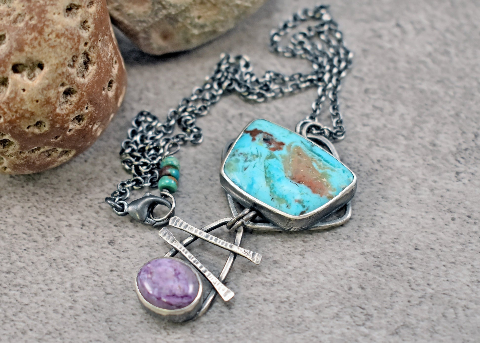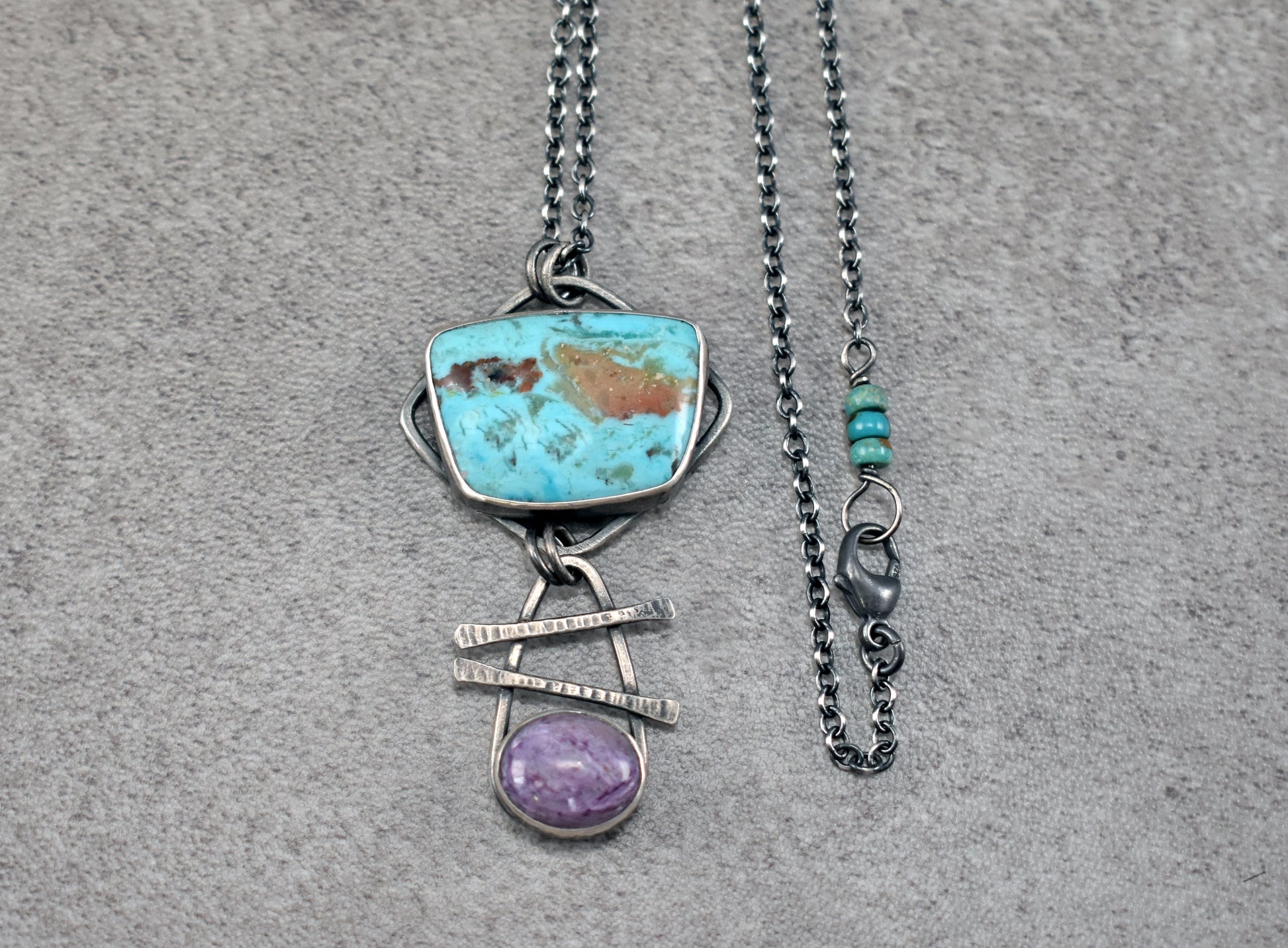 Turquoise, Charoite and Sterling Silver Necklace, Rustic Silversmith Pendant, Artisan Handmade Jewelry